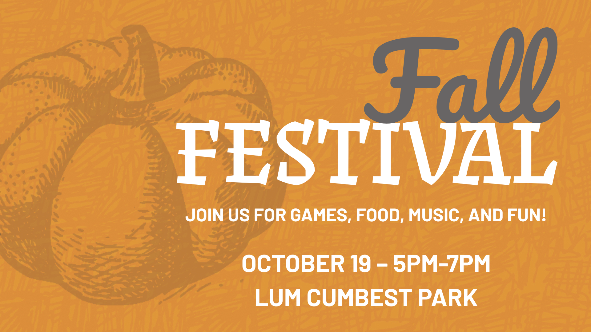 Join us at Lum Cumbest Park on October 19 for our annual Fall Festival! We will have yard and board games, hot dogs and hamburgers, and live music (Bluegrass Gospel artists Don Smith and Luke McDaniel).